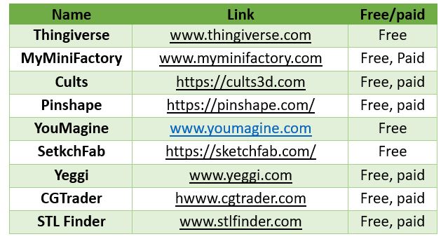 The simplest way to obtain a 3D model for 3DP is to download it from one of the many available online repositories. Many of these models are free. Some of the best such repositories are given in the table below.