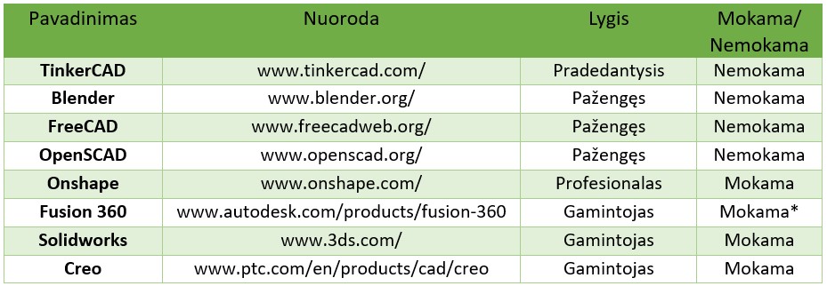 Yra daug programinių įrangų, kurių pagalba kuriami 3D modeliai. Jie gali būti pritaikyti ne tik profesionalams, bet ir pradedantiesiems. Be to, galima atrasti ir nemokamų modeliavimo programų. Keli jų pavyzdžiai pateikiami žemiau esančiame paveikslėlyje. Taip pat galima rasti ir nemažai mokymo išteklių bei mokomosios medžiagos. Visa tai gali būti ypač naudinga siekiant išmokti, kaip patiems sukurti savo 3D modelį. Norint sukurti savo objektus, 3D modeliavimas yra nepamainomas gebėjimas.