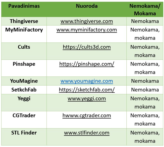 Paprasčiausias būdas gauti 3D spausdinimo modelį yra parsisiųsti jį į iš internetinių saugyklų. Dauguma šių modelių yra nemokami. Vienos geriausių tokių saugyklų pateiktos žemiau esančioje lentėje: