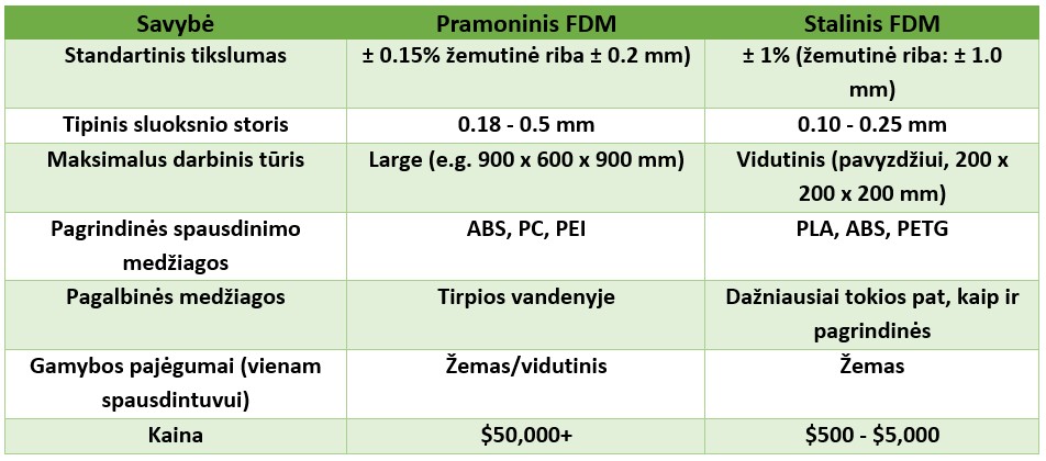 - FDM 3D spausdintuvai gali būti skirstomi į dvi pagrindines grupes: pramoninius ir stalinius. Staliniai FDM 3D spausdintuvai tinkami prototipų gamybai ir mažiems gamybos kiekiams, kai tuo tarpu pramoniniai spausdintuvai naudojami visu pajėgumu veikiančių didelių kokybiškų dalių gamybai, kurioms būdingas didelis tikslumas ir aukštatemperatūrių savybės. Pagrindiniai skirtumai tarp stalinio ir pramoninio spausdintuvo yra su jomis siejamos išlaidos ir gamybos pajėgumai. Skirtumai matomi žemiau esančioje lentelėje: