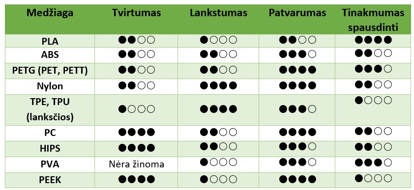 Dažniausiai 3D spausdinimui naudojamos FDM medžiagos: