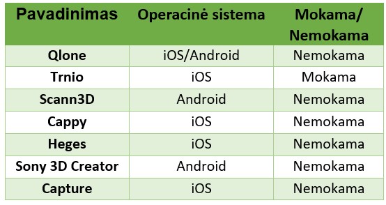 3D skenavimas yra yra greitas ir tikslus būdas perkelti fizinius objekto duomenis į kompiuterį skaitmeniniame formate naudojant 3D skenerį ar tinkamas programas turintį išmanųjį telefoną. 3D skenavimo programos yra paremtos fotogrametrija. Tai yra yra pasyvi technologija, pagrįsta vaizdais, kurie yra transformuojami iš 2D į 3D kartometrinius modelius. Kai kurios 3D skenavimo programos pateiktos žemiau matomoje lentelėje: