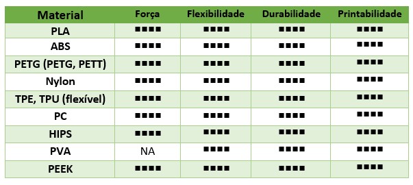 Os materiais FDM mais comuns na Impressão 3D encontram-se resumidos na tabela seguinte, juntamente com algumas indicações sobre as suas caraterísticas.