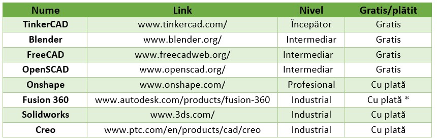 Există multe software-uri disponibile pentru crearea de modele 3D, inclusive unele gratuite, pentru toate nivelurile, de la începători la profesioniști. Unele dintre acestea sunt prezentate în tabelul de mai jos. În plus, există și o mulțime de resurse educaționale și tutoriale care pot fi utilizate pentru a învăța cum să vă creați propriile modele 3D. Modelarea 3D este o abilitate indispensabilă atunci când doriți să vă creați propriile obiecte.