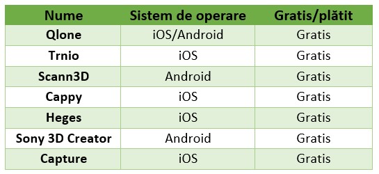 Scanarea 3D e o metodă folosită pentru a capta forma unui obiect folosind un scanner 3D sau un smartphone cu o aplicație adecvată. Aplicațiile de scanare 3D se bazează pe fotogrametrie, o tehnologie care creează modele 3D din fotografii 2D realizate din diferite unghiuri, care sunt apoi “lipite” împreună de un software. Unele aplicații de scanare 3D sunt date în tabelul de mai jos.