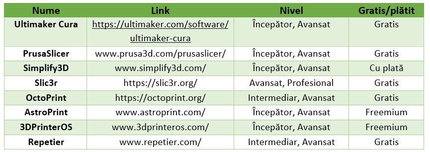 Slicer-ele sunt software-uri care iau modelul 3D (cel mai adesea în format .stl), îl împart în mai multe straturi, includ setări ale imprimantei 3D (cum ar fi temperatura, înălțimea stratului, viteza de imprimare etc.) și generează fișierul G-code care oferă imprimantei 3D indicațiile de care are nevoie pentru realizarea obiectului 3D. Există multe slicer-e disponibile și majoritatea sunt gratuite. Unele dintre cele mai populare sunt prezentate în tabelul de mai jos.