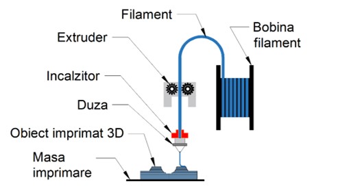 O imprimantă 3D FDM folosește un filament continuu, care este introdus printr-un mecanism cu roți dințate într-un încălzitor care-l încălzește și-l topește. Apoi, filamentul topit este ejectat din duză și depus pe masa de imprimare, în geometria dorită. După fiecare strat, masa de imprimare (sau duza) se deplasează pe direcția verticală și se adaugă următorul strat, până când obiectul este complet imprimat 3D. Procesul este schematizat în figura de mai jos.