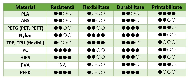 Cele mai frecvente materiale FDM folosite în 3DP sunt prezentate în tabelul de mai jos, împreună cu unele indicații despre caracteristicile lor.